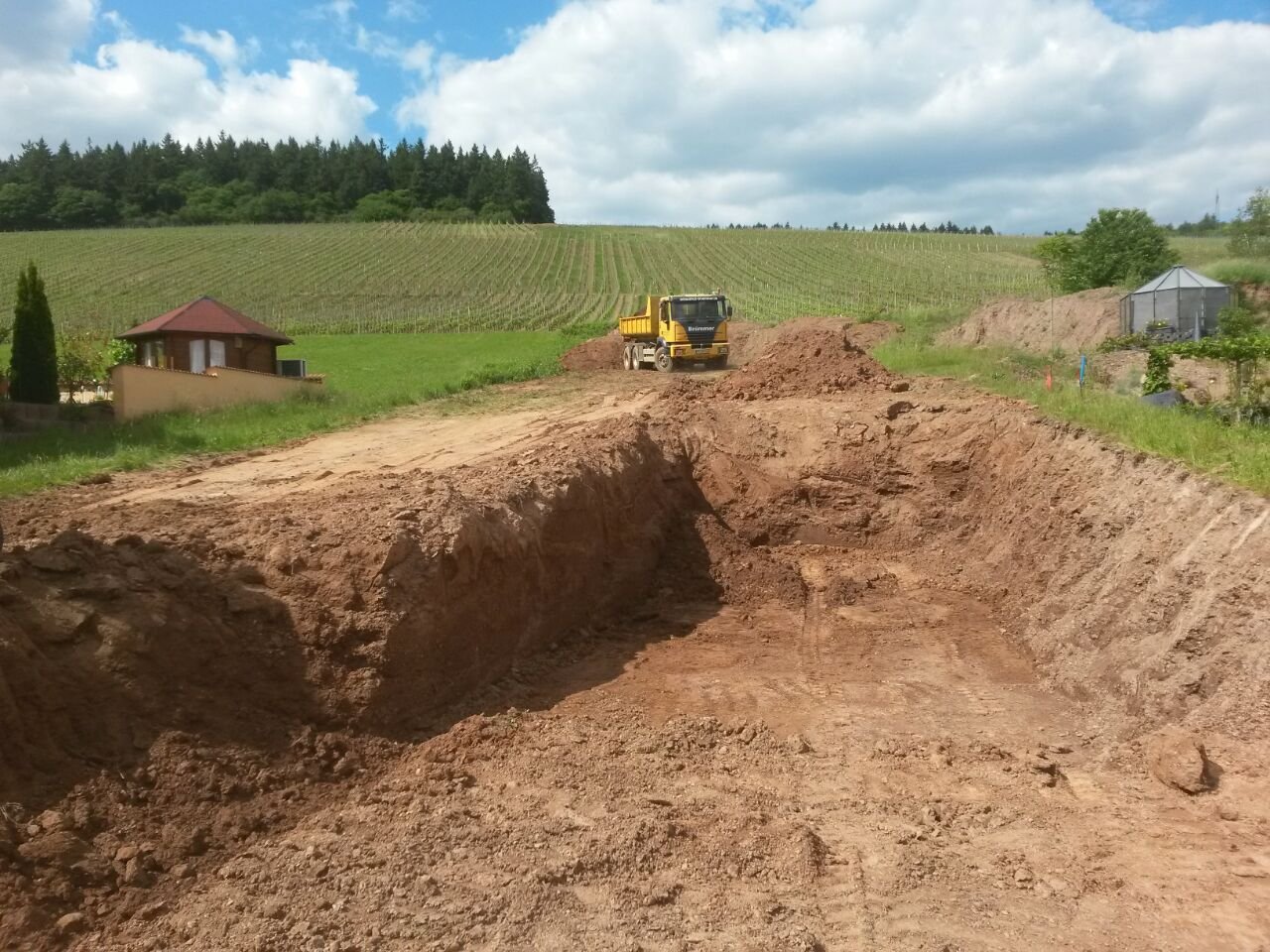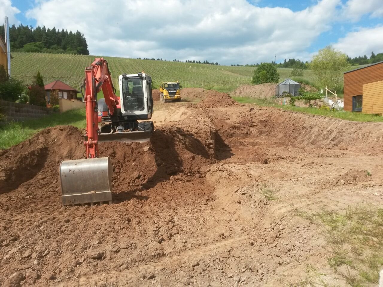 Dieses Projekt umfasste den präzisen Aushub der Baugrube für ein Einfamilienhaus mit Keller in einer anspruchsvollen Hanglage. Die besondere Herausforderung lag im effizienten Bodenmanagement: Ein Großteil des ausgehobenen Materials wurde direkt auf dem Grundstück oberhalb der Baugrube deponiert, um später für die natürliche Modellierung des Geländes und die Gestaltung der Außenanlagen verwendet werden zu können. Der verbleibende Überschuss wurde fachgerecht abgefahren und entsorgt. Nach Fertigstellung des Aushubs lieferten wir den Schotter für den Unterbau der Bodenplatte, der anschließend schichtweise eingebaut und verdichtet wurde. Zur Qualitätssicherung und Freigabe durch die Bauleitung wurde die Druckfestigkeit des Untergrunds erfolgreich getestet, womit die Baugrube termingerecht an das Rohbau-Team übergeben werden konnte.
