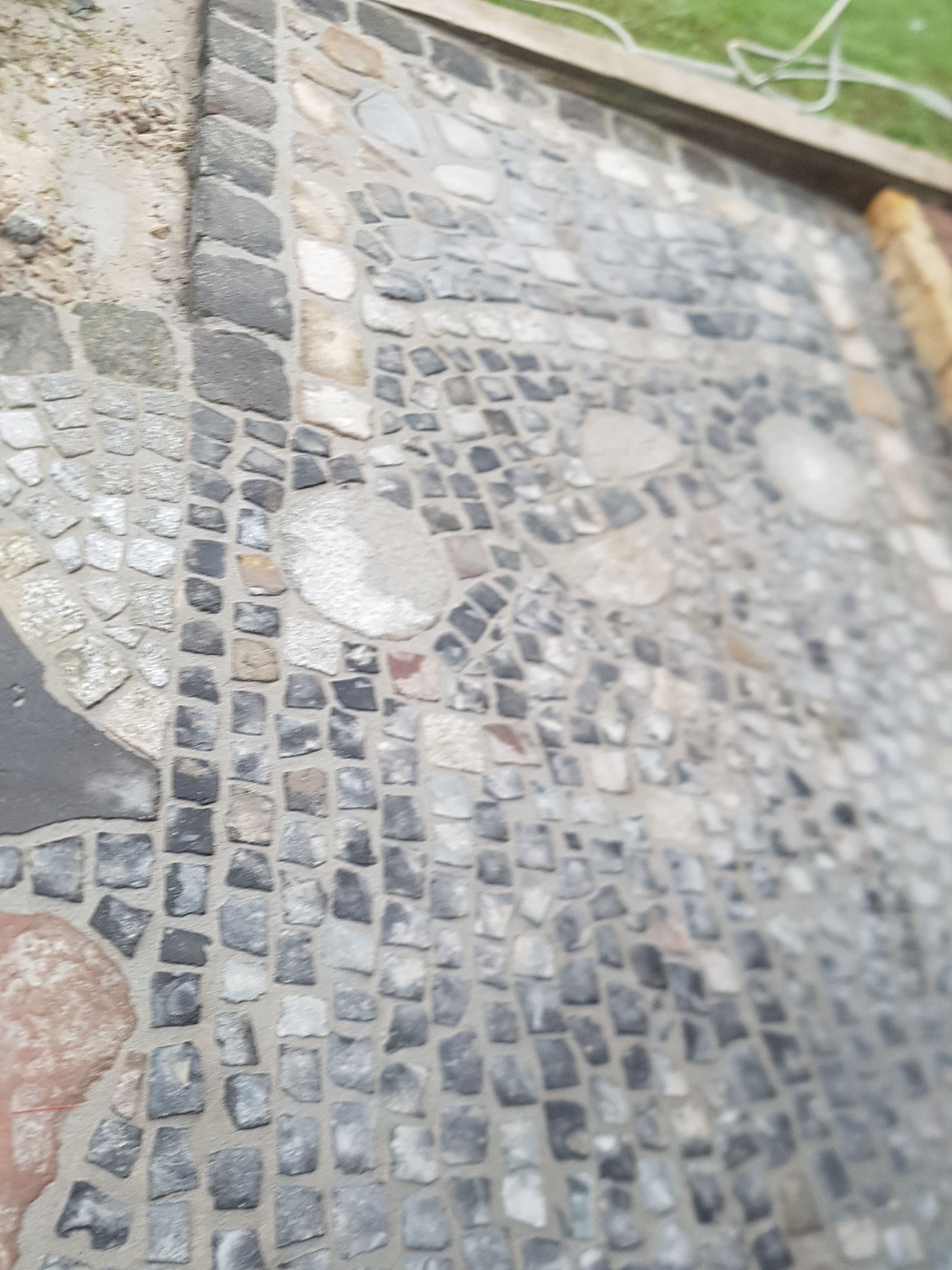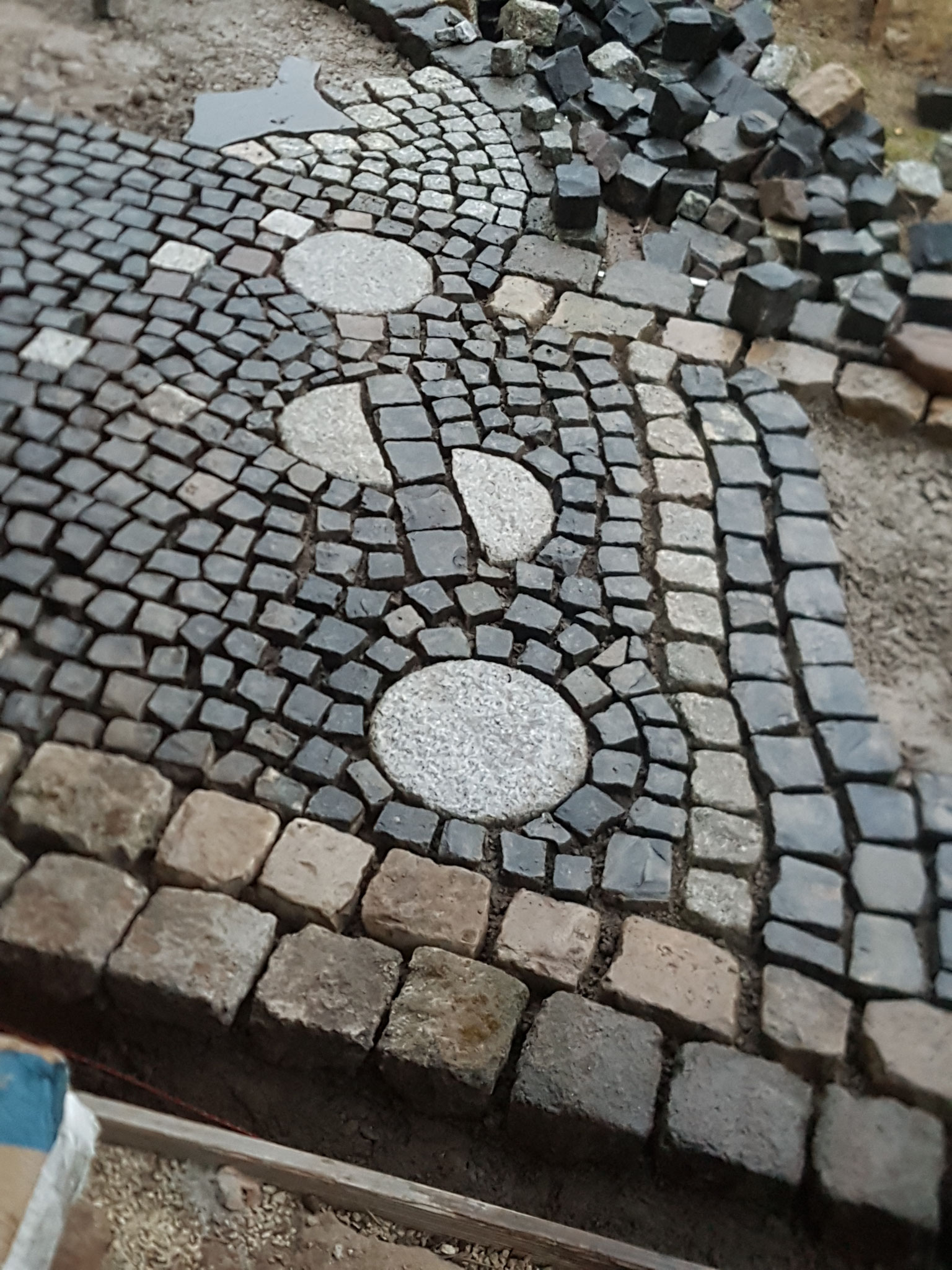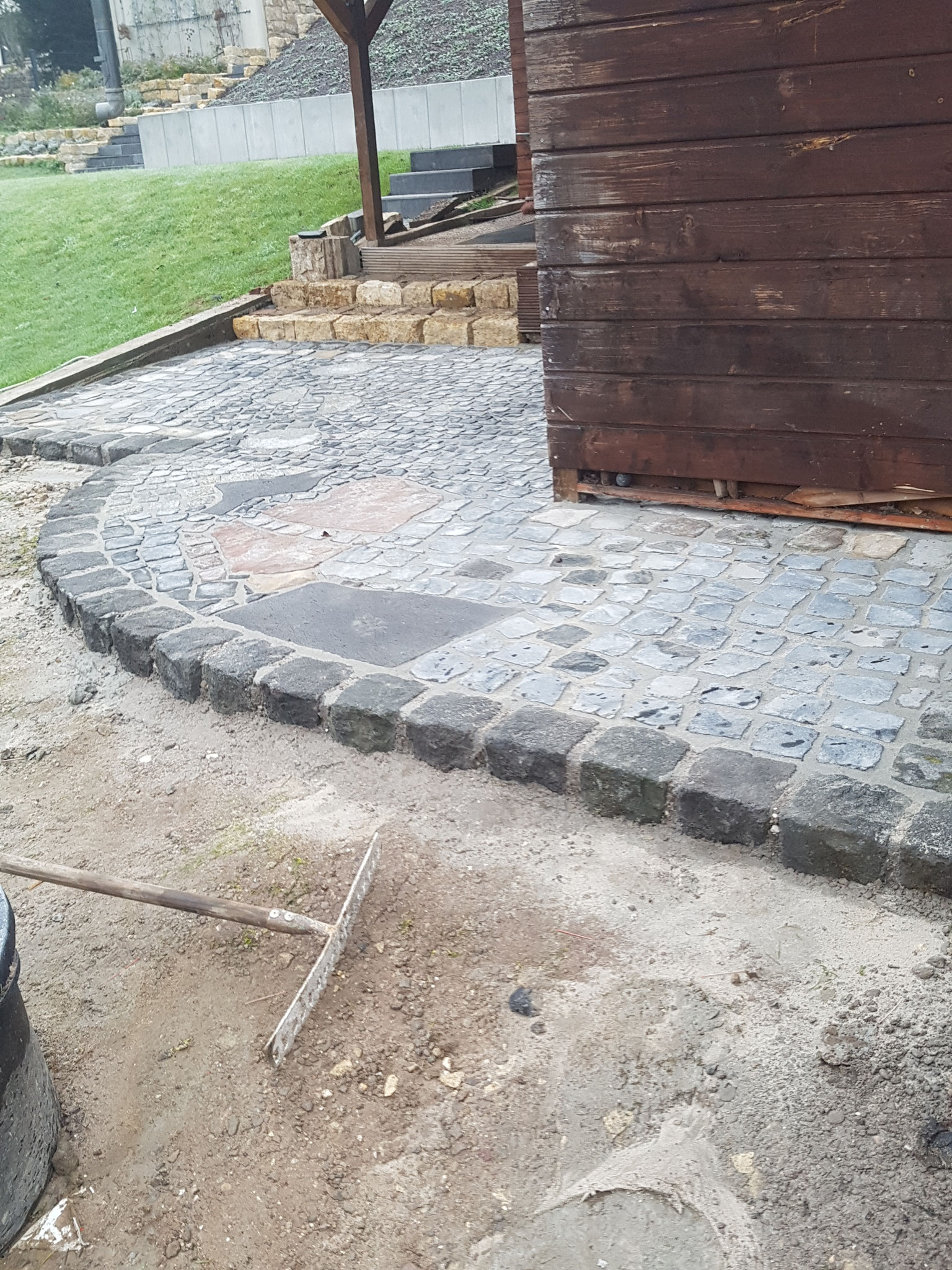 Dieses anspruchsvolle Projekt zur Gestaltung der Außenanlage startete mit dem notwendigen Bodenaushub und der fachgerechten Entsorgung des Materials. Als Fundament für die extrem langlebige Pflasterfläche wurde zunächst Schotter geliefert, eingebaut und verdichtet. Die Hauptleistung war die Verlegung der Natursteine: Um höchste Stabilität und Dauerhaftigkeit zu garantieren, wurde die gesamte Fläche betoniert, wobei jeder einzelne Basaltkopfstein und jeder Naturrechteckstein in traditioneller Handwerkskunst einzeln in den frischen Beton geklopft wurde. Die Kombination der dunklen Basaltsteine mit den helleren Rechtecksteinen schafft einen eleganten, kontrastreichen Effekt. Die Fläche wird durch eine Umrandung aus größeren Steinen klar hervorgehoben und durch eine integrierte Natursteintreppe funktional ergänzt. Abschließend wurde die gesamte Fläche zur Sicherung der Fugen und als Schutz vor Unkraut mit Trasszement professionell geschlämmt, was die zeitlose Ästhetik des Projekts perfekt abrundet.
